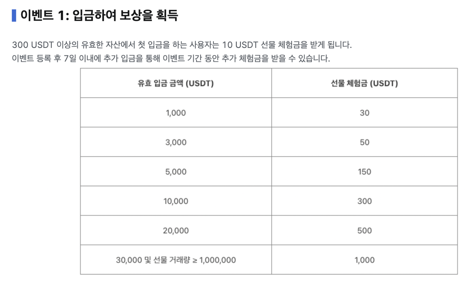 이벤트 내용을 보면 입금하는 금액에 따라서 USDT 선물 체험금을 준다고 적혀있다.