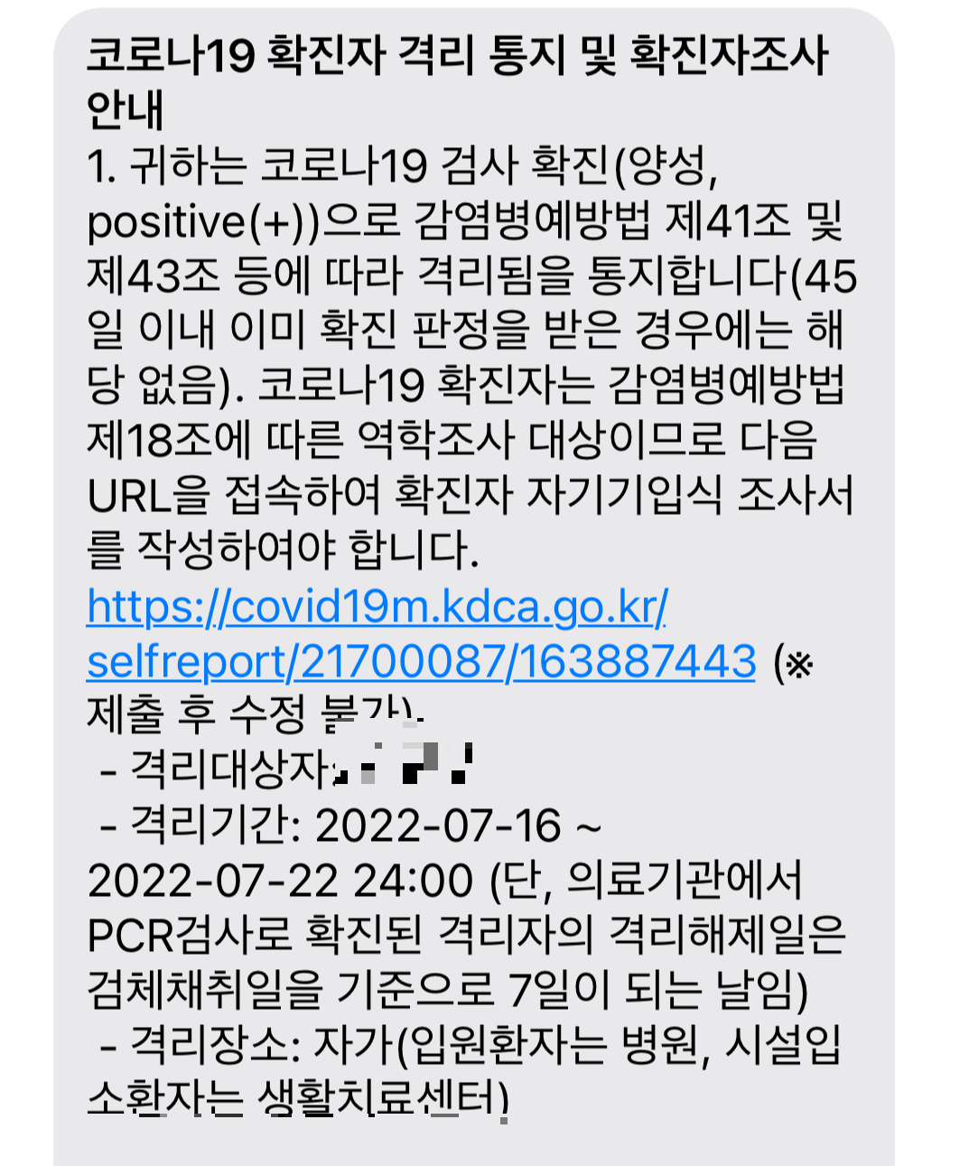 격리 기간 2022년 7월 16일 ~ 7월 22일 24시까지 .... 이 게시글을 작성하면서 앞으로 2시간뒤면 격리가 끝난다