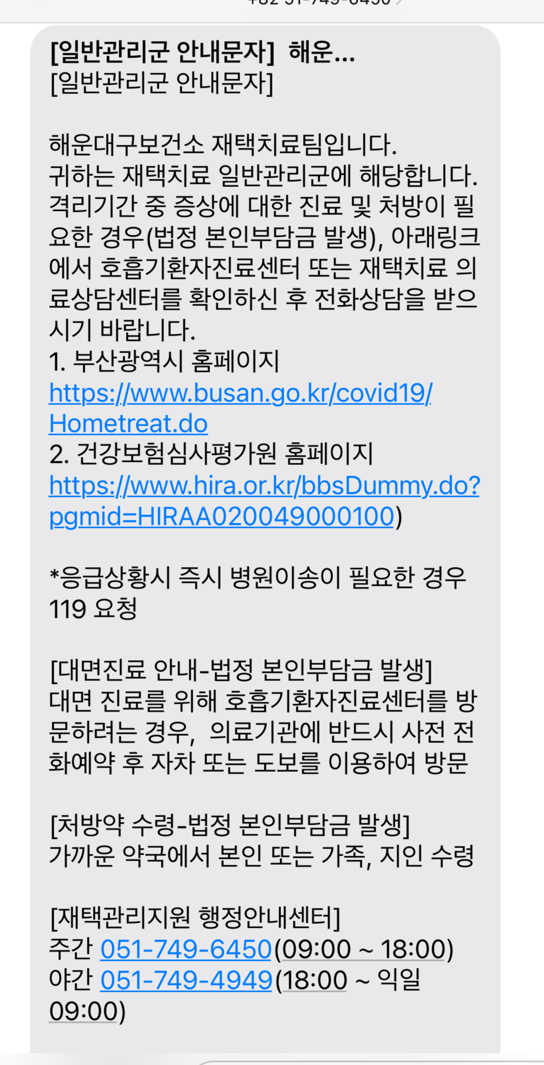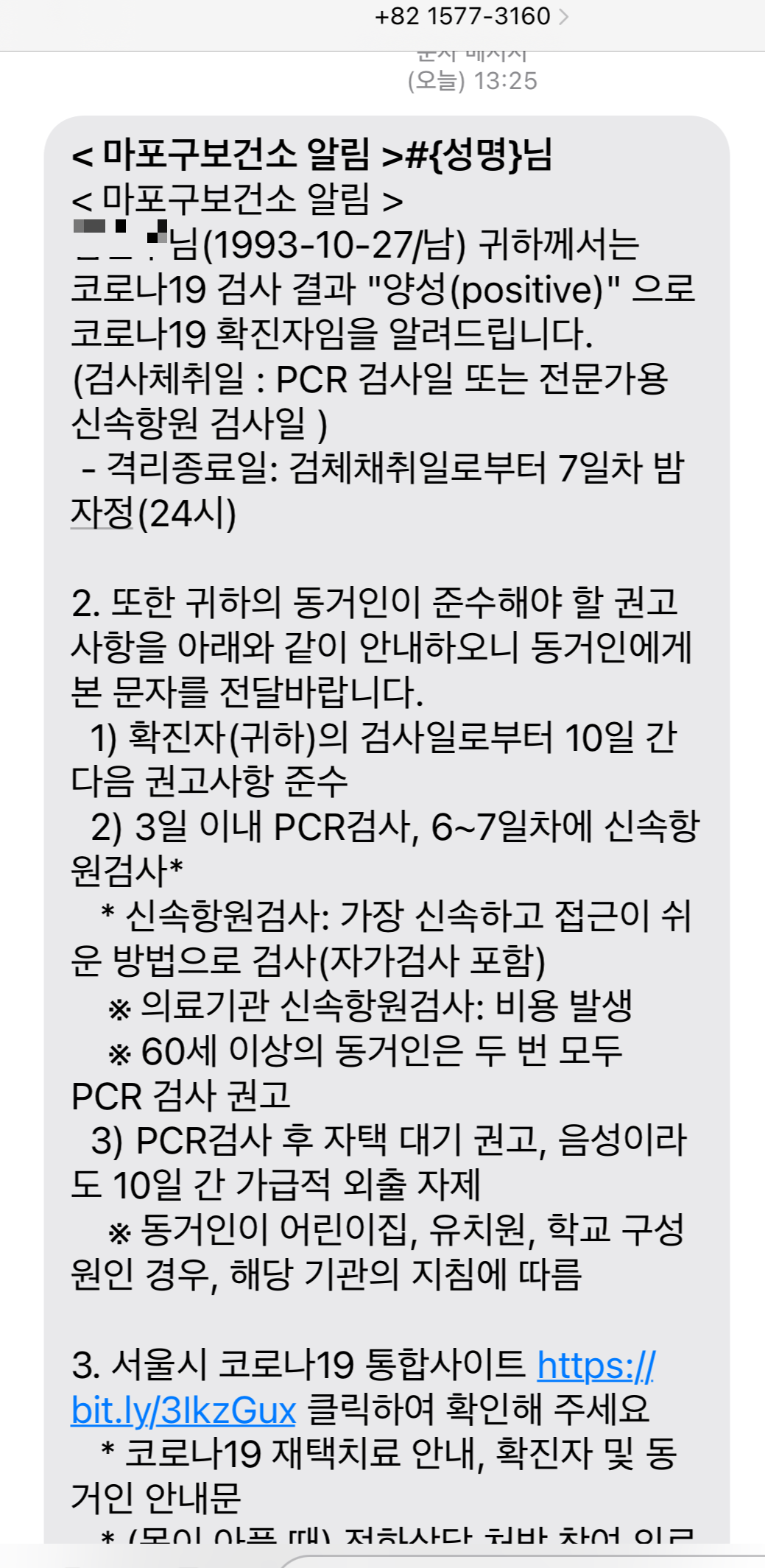 서울에서 PCR 검사를 끝내고 부산으로 이동하면서 받은 메세지.