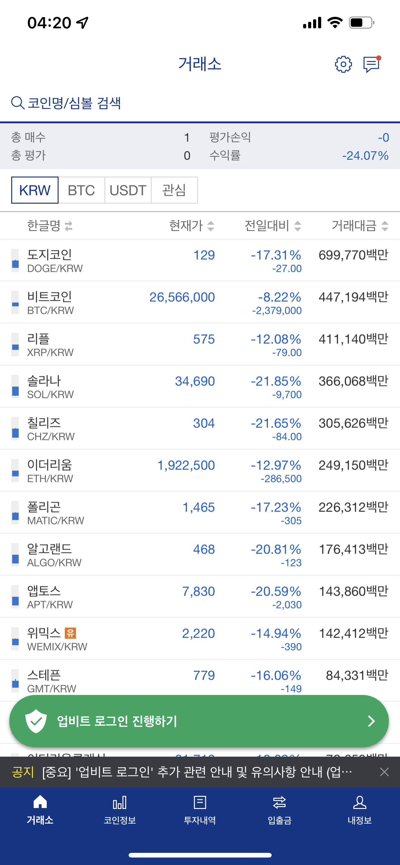 현재 업비트 거래량과 올블루