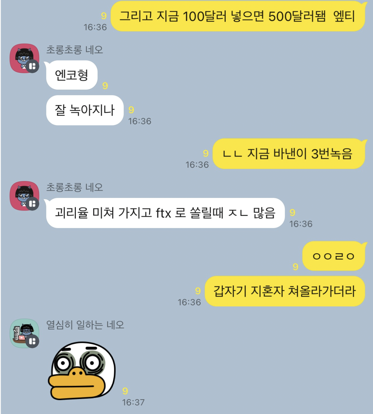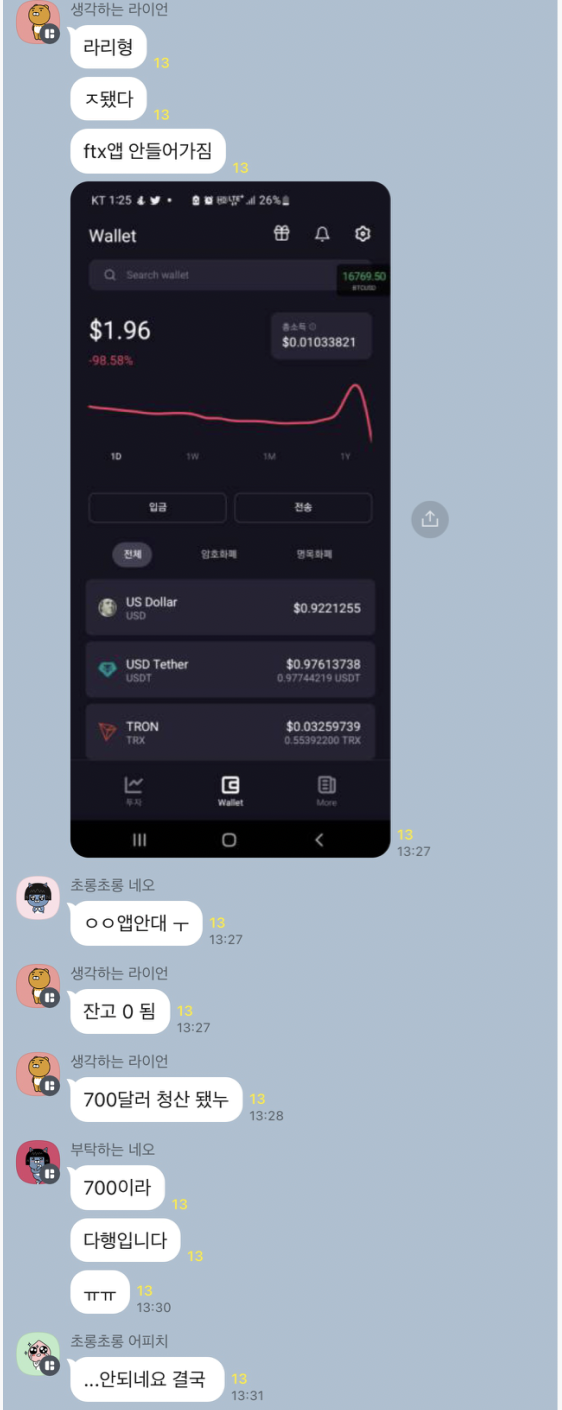 점심 데이트를 하던 중에 단톡방에 FTX 어플에 들어 갈 수 없다는 채팅과 함께 단톡방이 난리납니다.