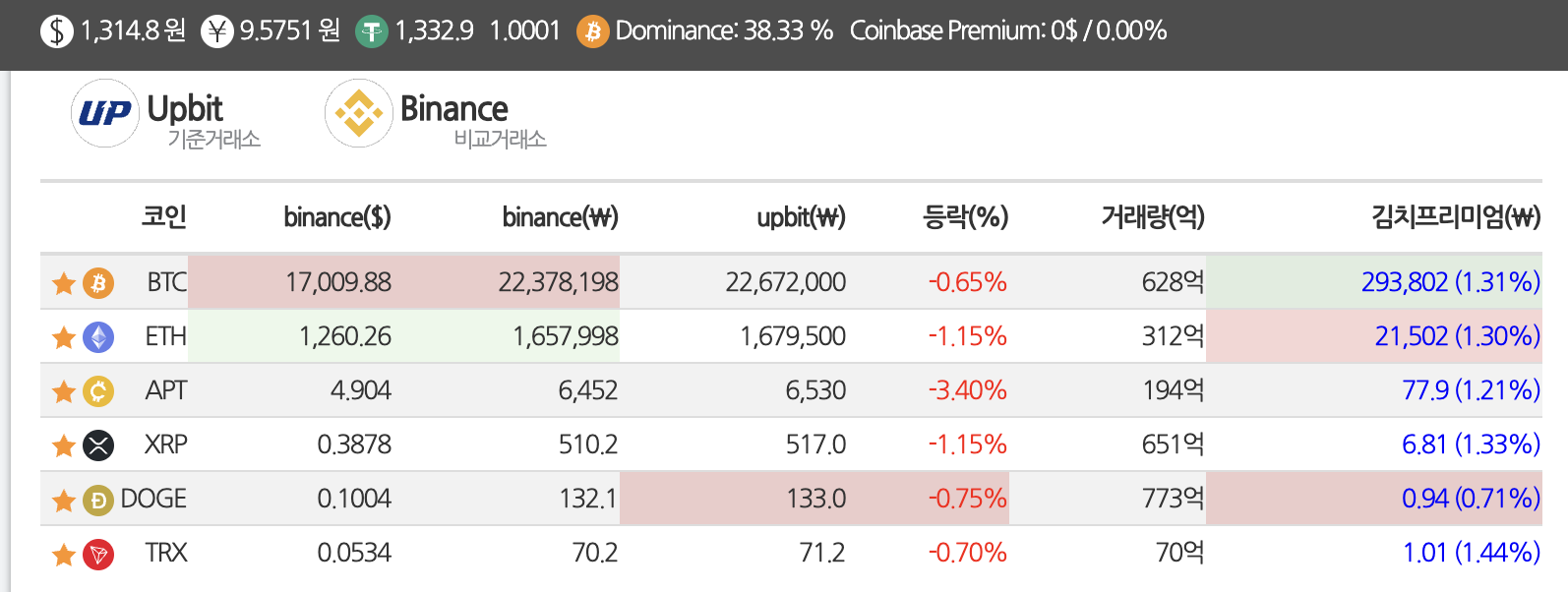 1달러 1314.8원 / 1테더 1332.9원 김프 1.31퍼인데 출국해야하나 고민중이다.