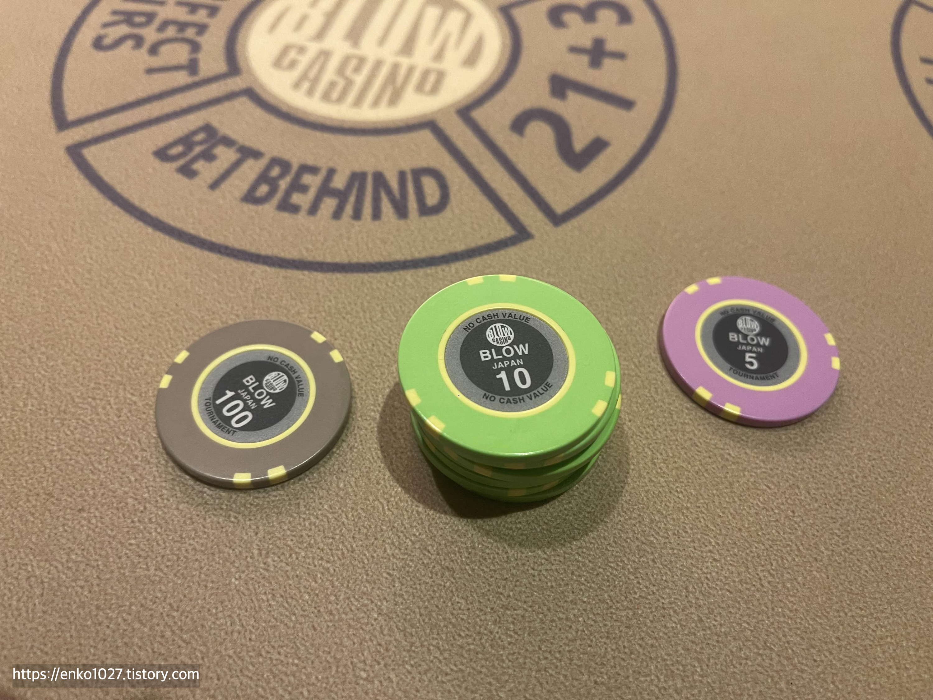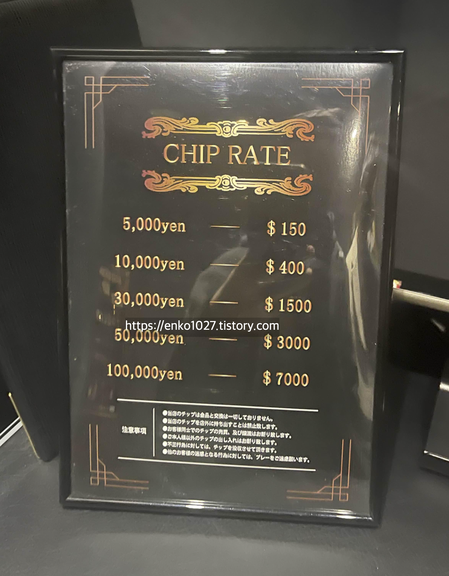 기본 입장료 1000엔을 지불하면 음료 및 술 무제한 리필 + 칩 50달러를 받습니다. 대충 100달러당 3000엔 정도네요.