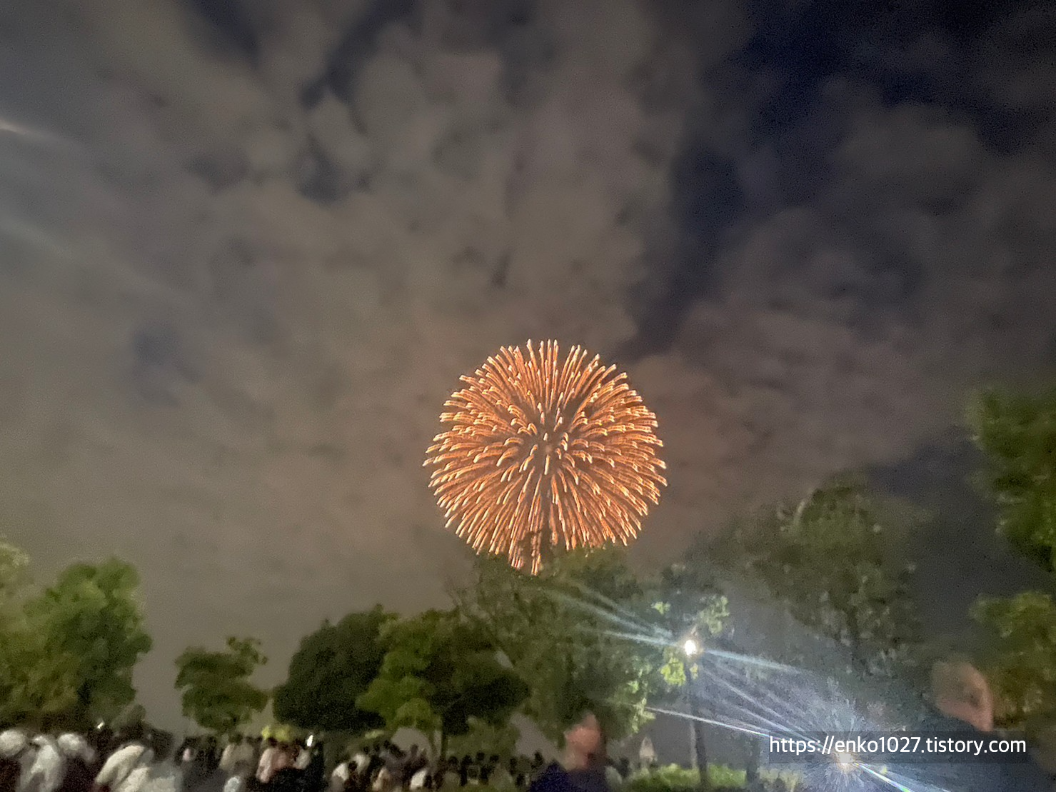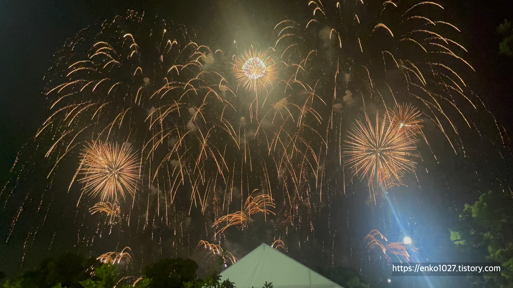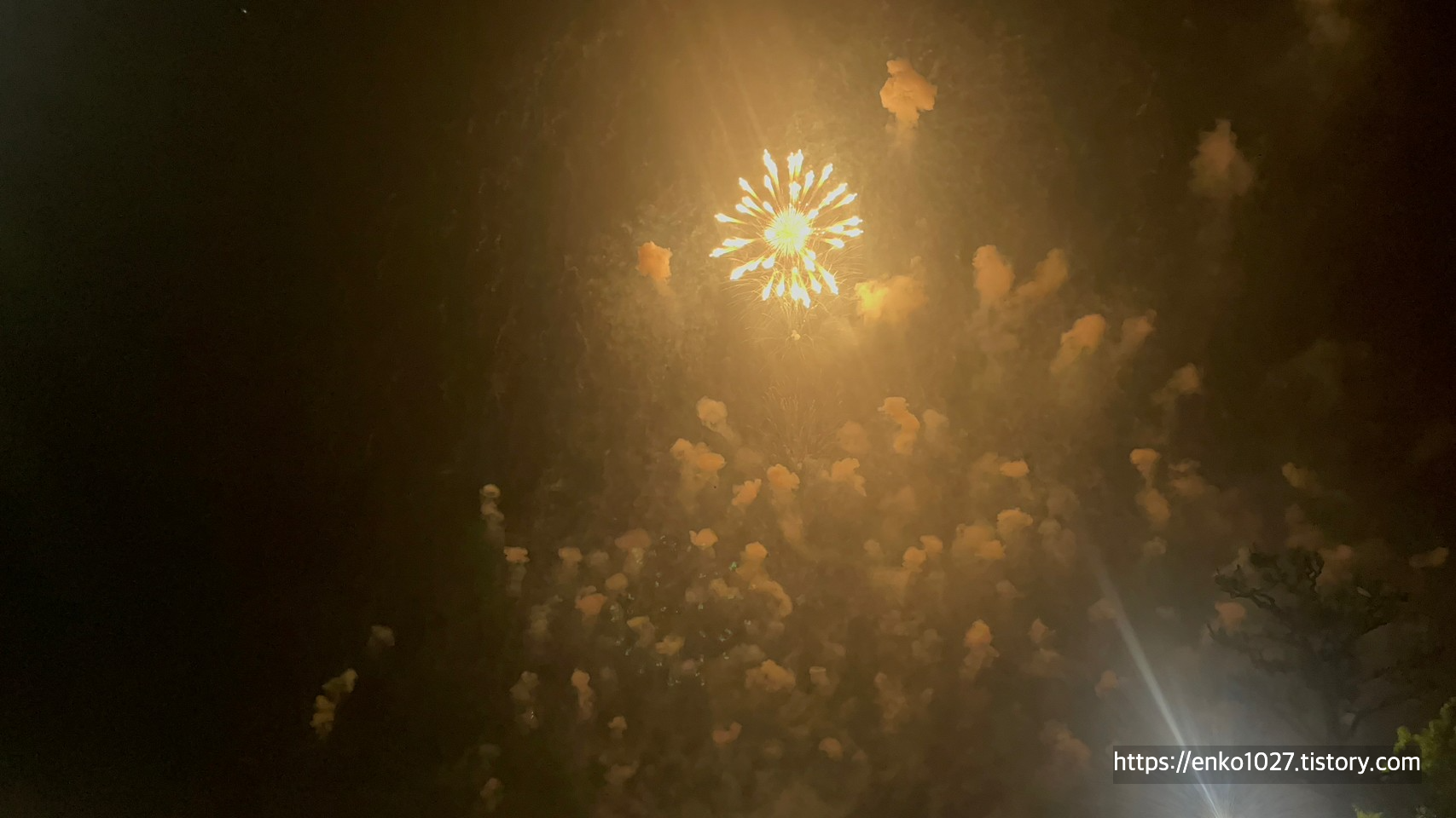 택시를 내리고 불꽃놀이 장소로 이동하던 중에 폭발음이 들려서 확인했더니 한 발씩 쏘기 시작했습니다.