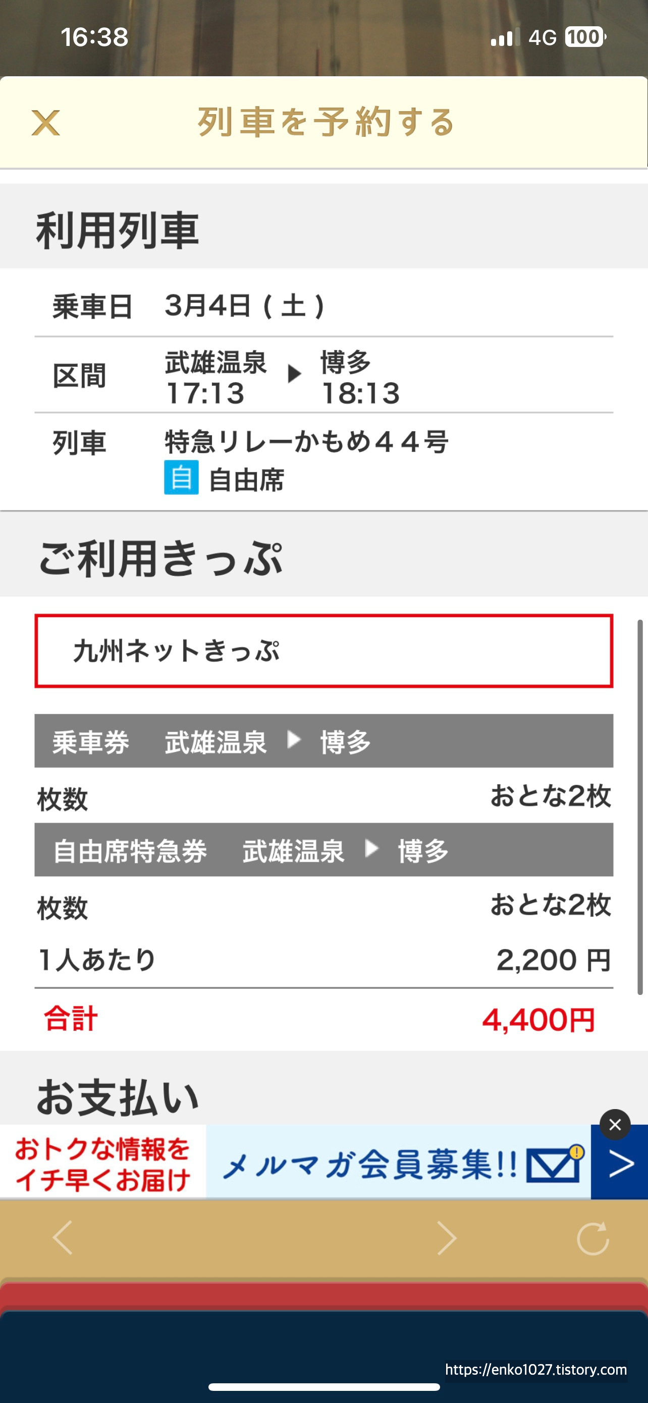 JR큐슈의 어플을 다운 받아서 표를 예약하면 가격이 2200엔이 됩니다. ㅋㅋㅋ 다들 꼭 이용하세요
