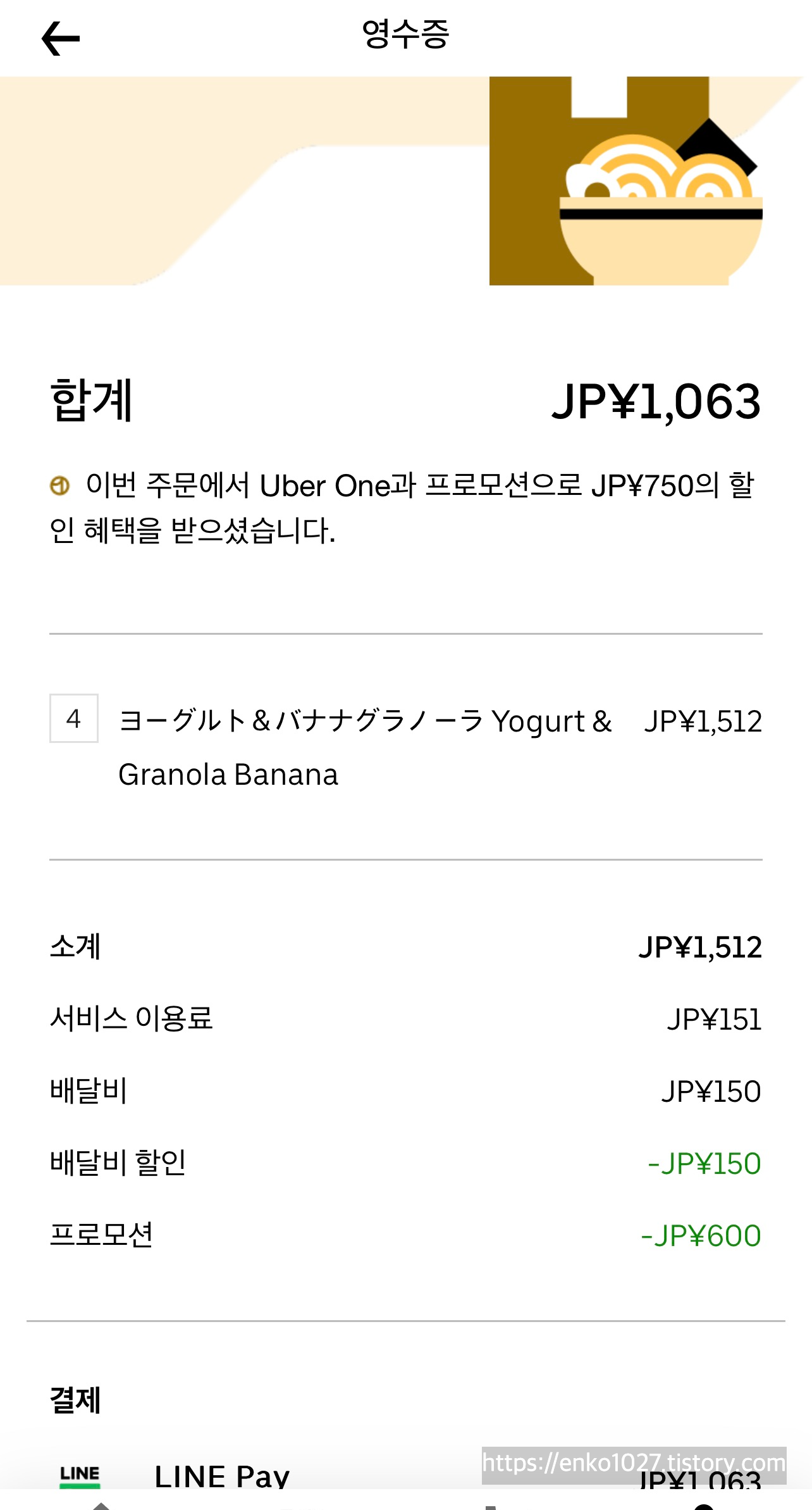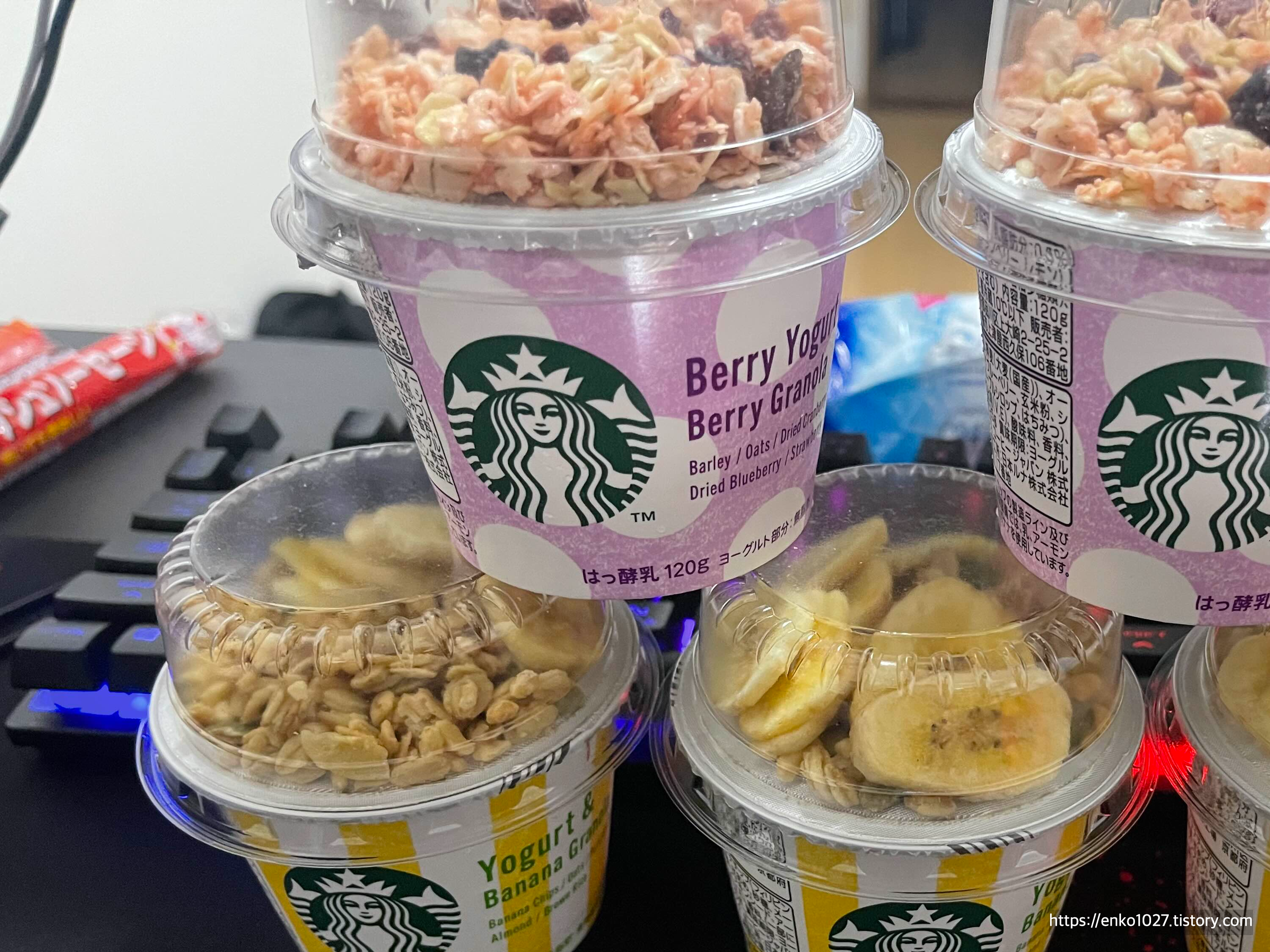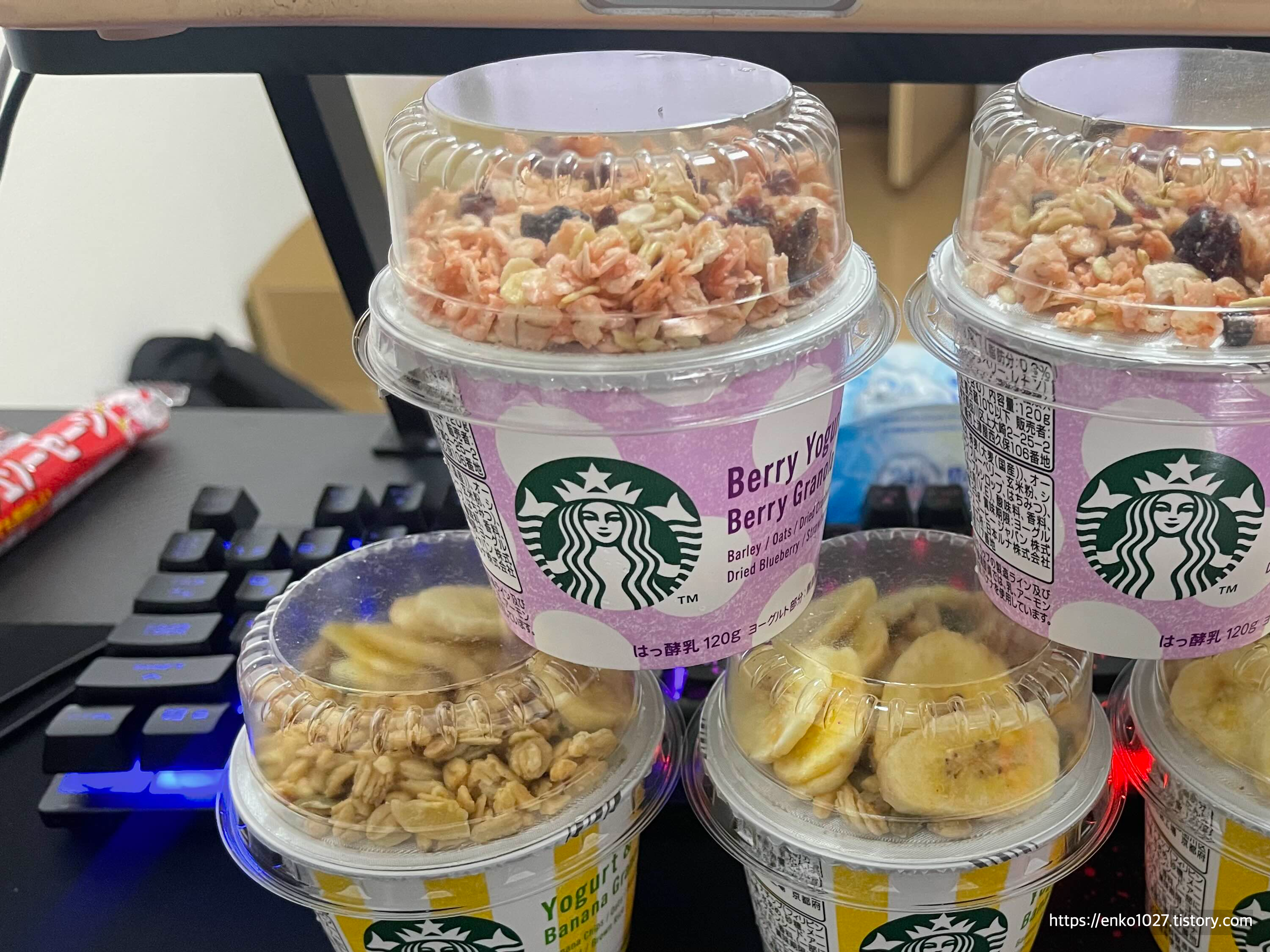 집으로 돌아와서는 일급 1096엔으로 스타벅스 바나나 요거트를 4개 주문했습니다.