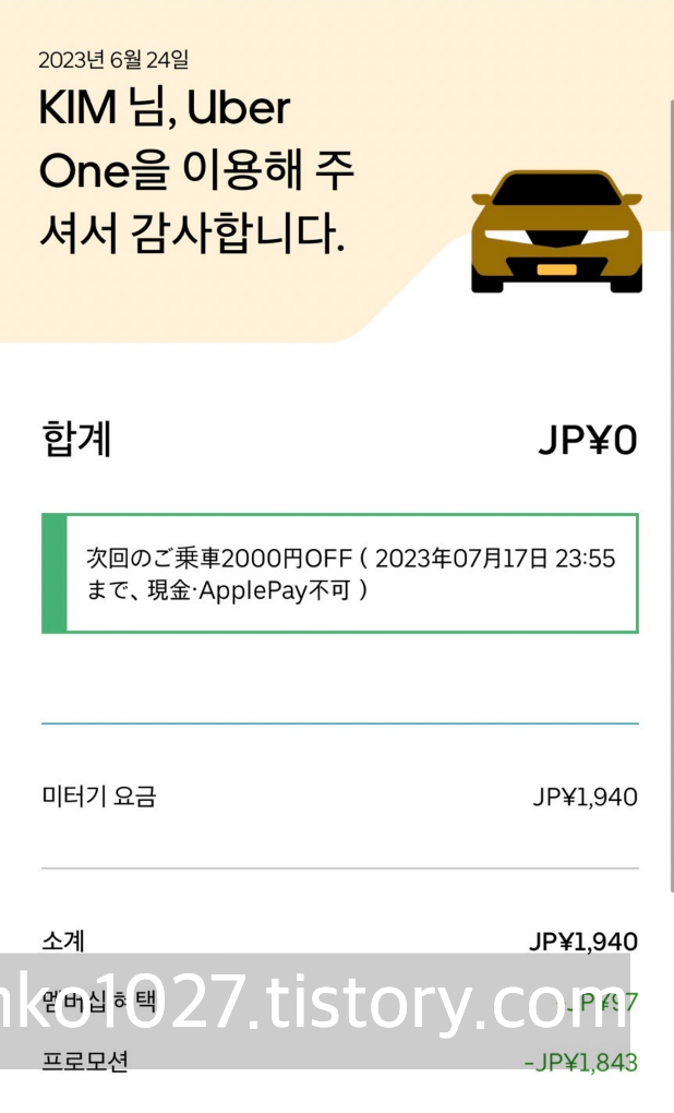 저는 우버 택시를 타고 이동했습니다. 가격은 1940엔이 나왔습니다.