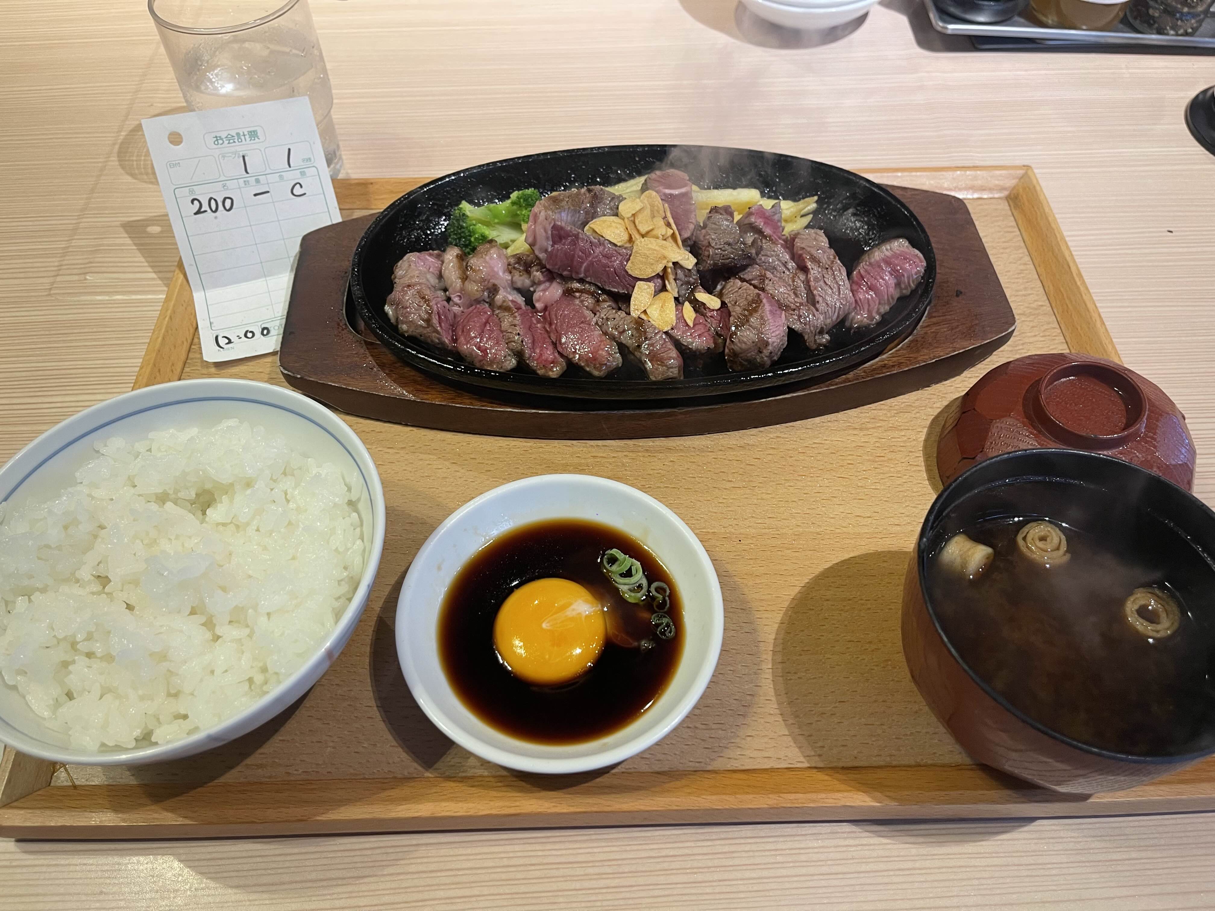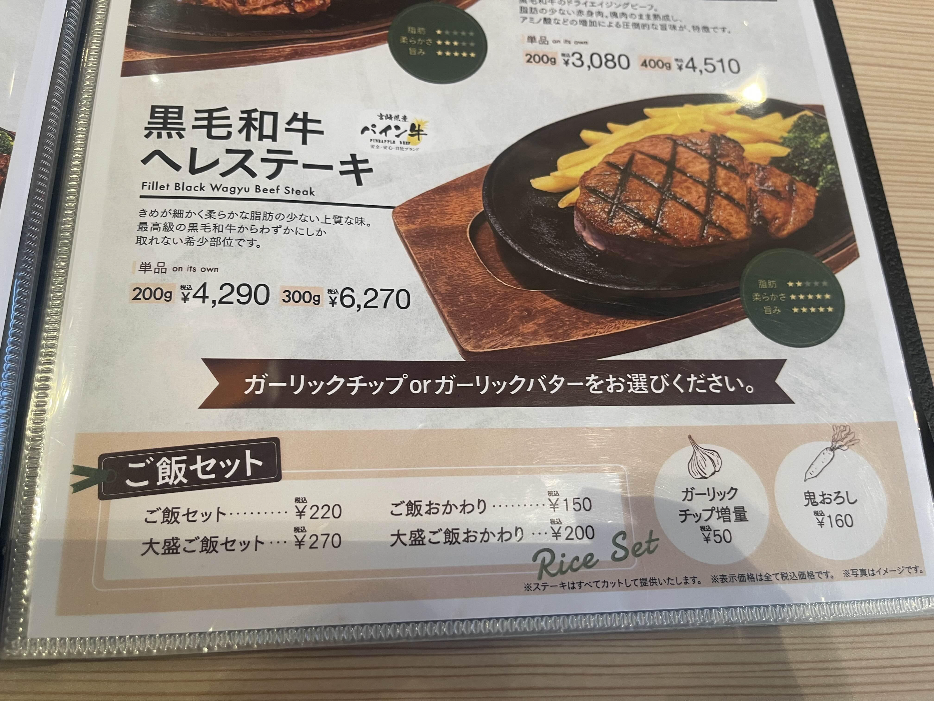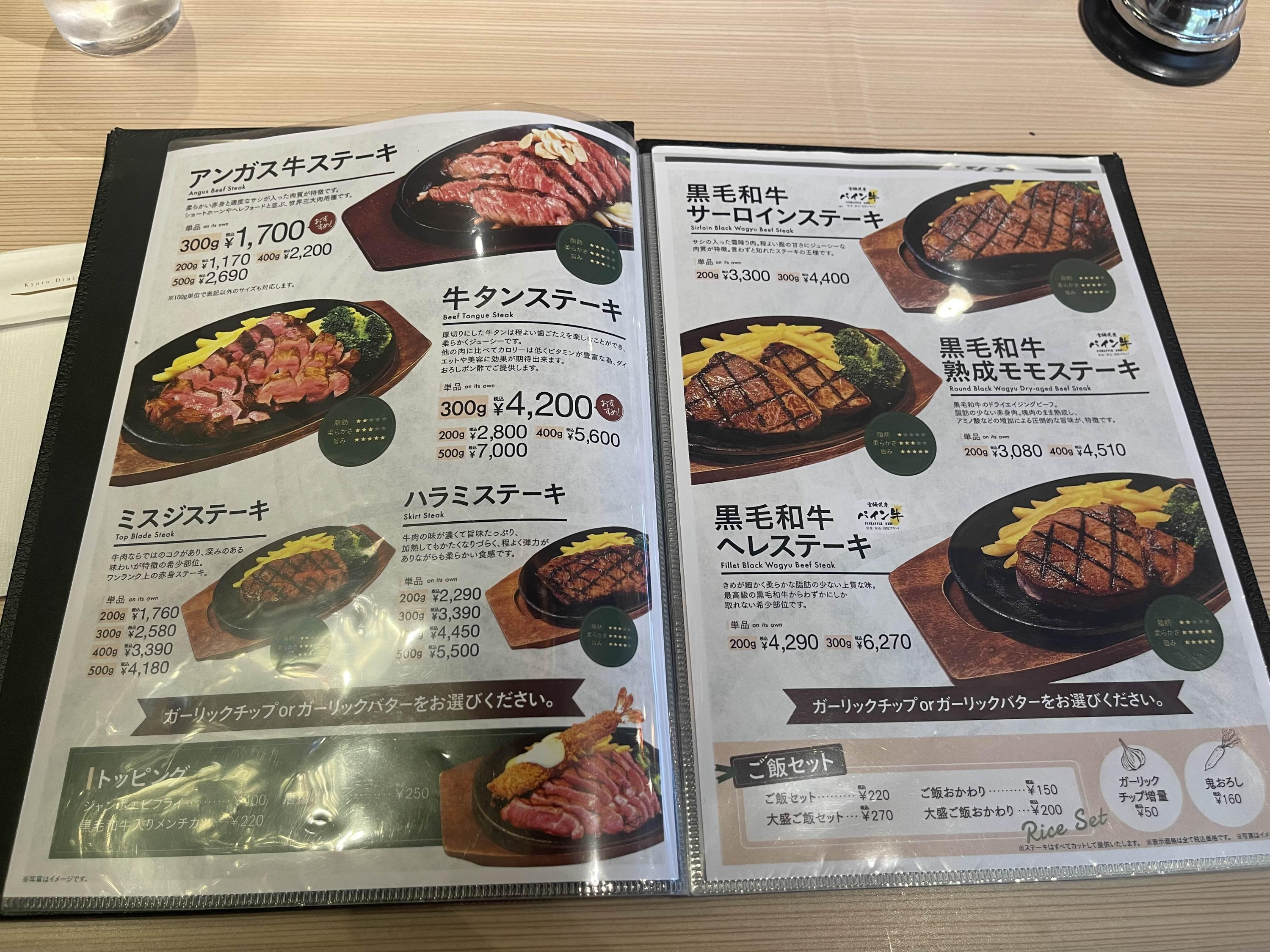 저는 왼쪽 맨 위에 앙가스규스테이키 (アンガス牛ステーキ) 200g을 먹습니다.