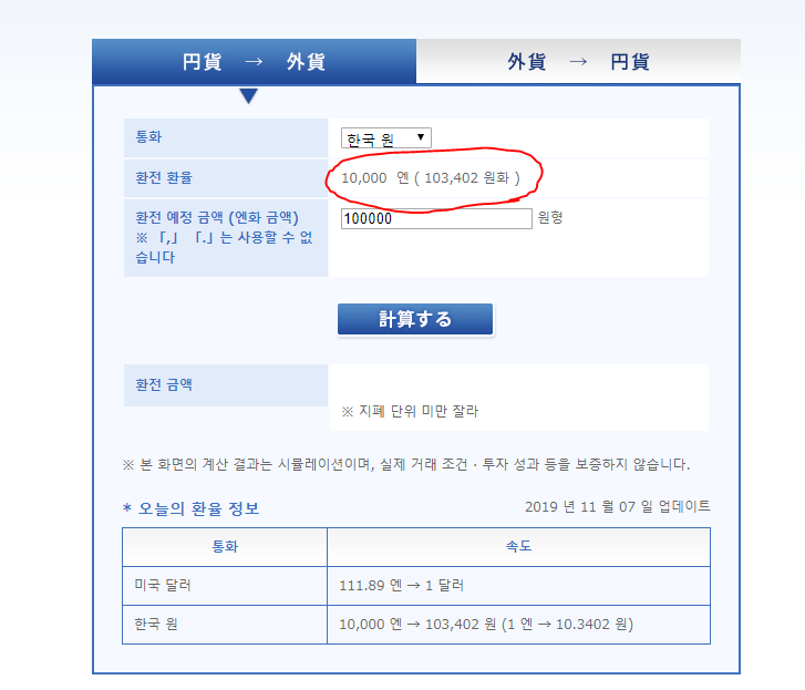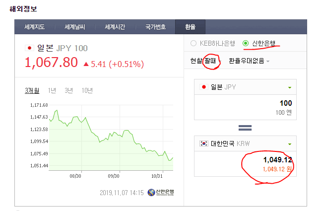 일본 엔화를 한국에 가져가서 판다면 100엔당 1049.12엔입니다.