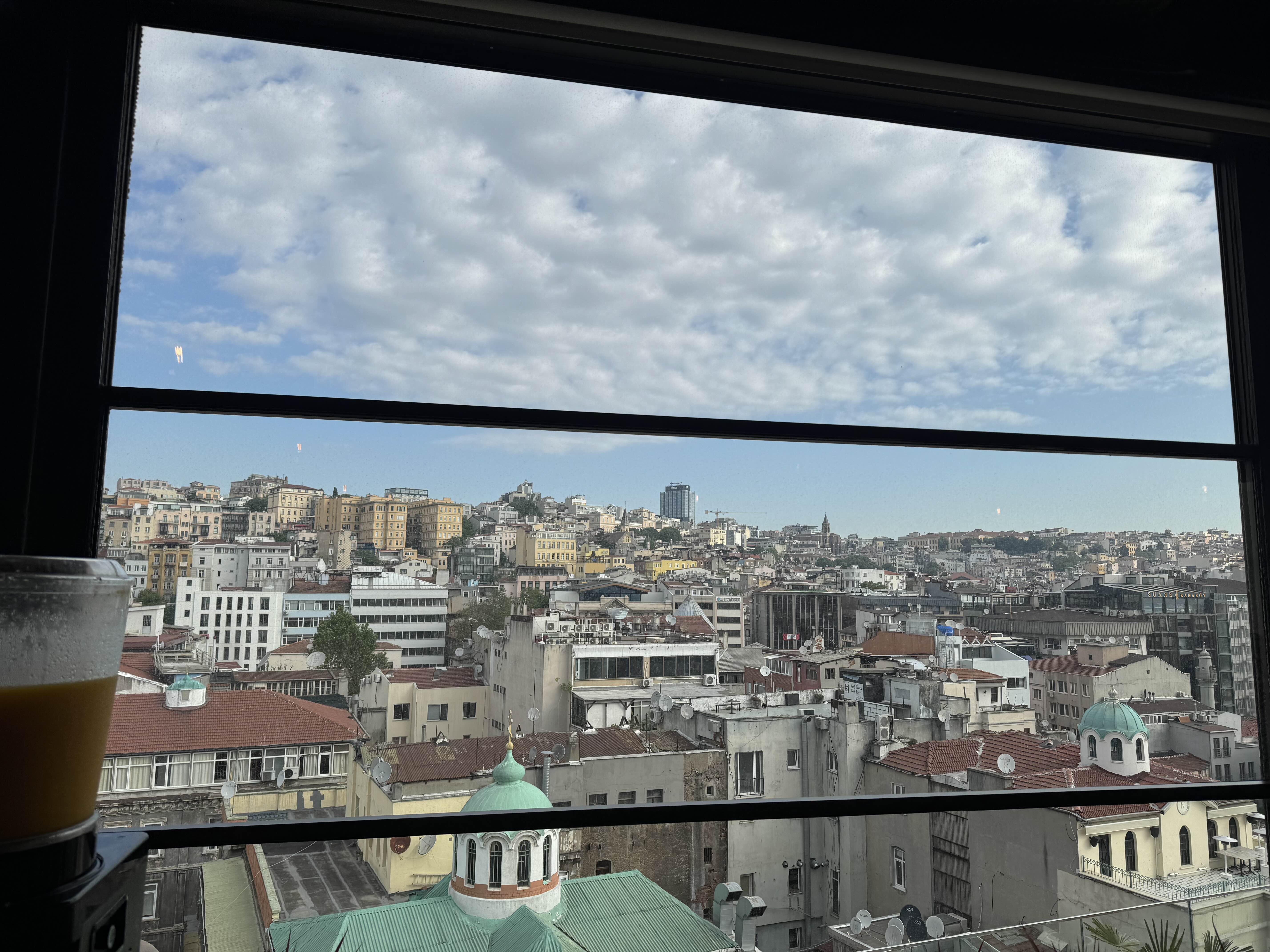 창문을 보면 꽤 많이 더럽다. 사진의 중심부 끝자락에 모스크가 보인다.