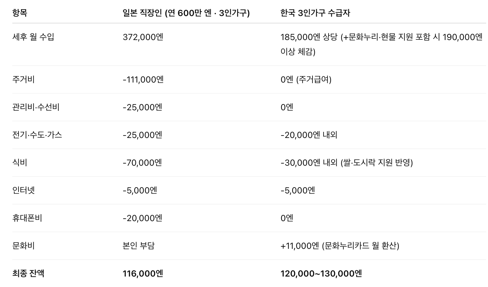 - 식비: 쌀·도시락·푸드뱅크 등 현물 지원 반영 시, 실제 지출 약 -3만 엔 수준