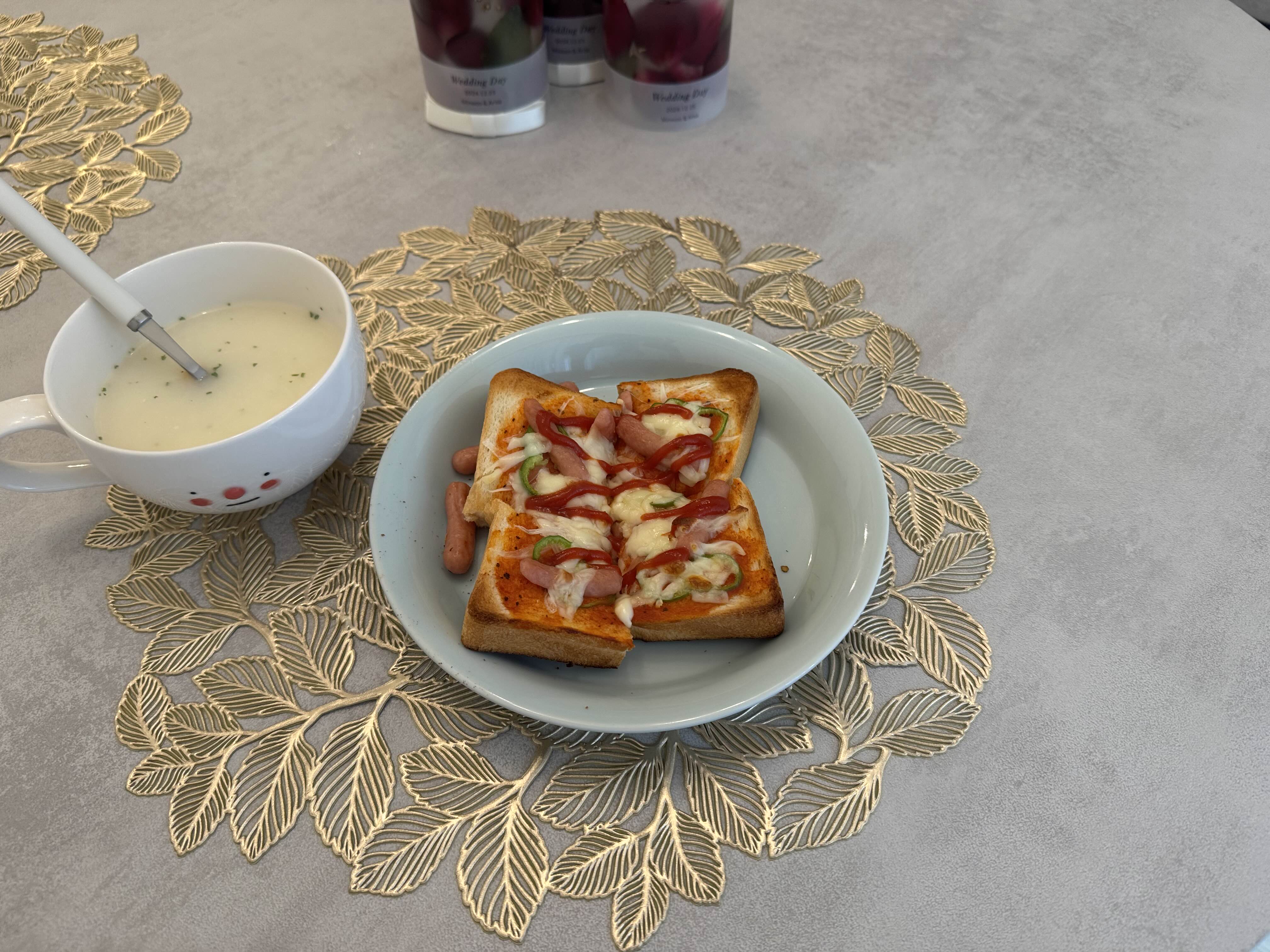 며칠 뒤, 평일 아침이 되니 와이프가 출근 전에 먹고 출근해라고 피자빵이랑 수프 만들어줌 ㅎㅎ. 님들도 결혼하세요.