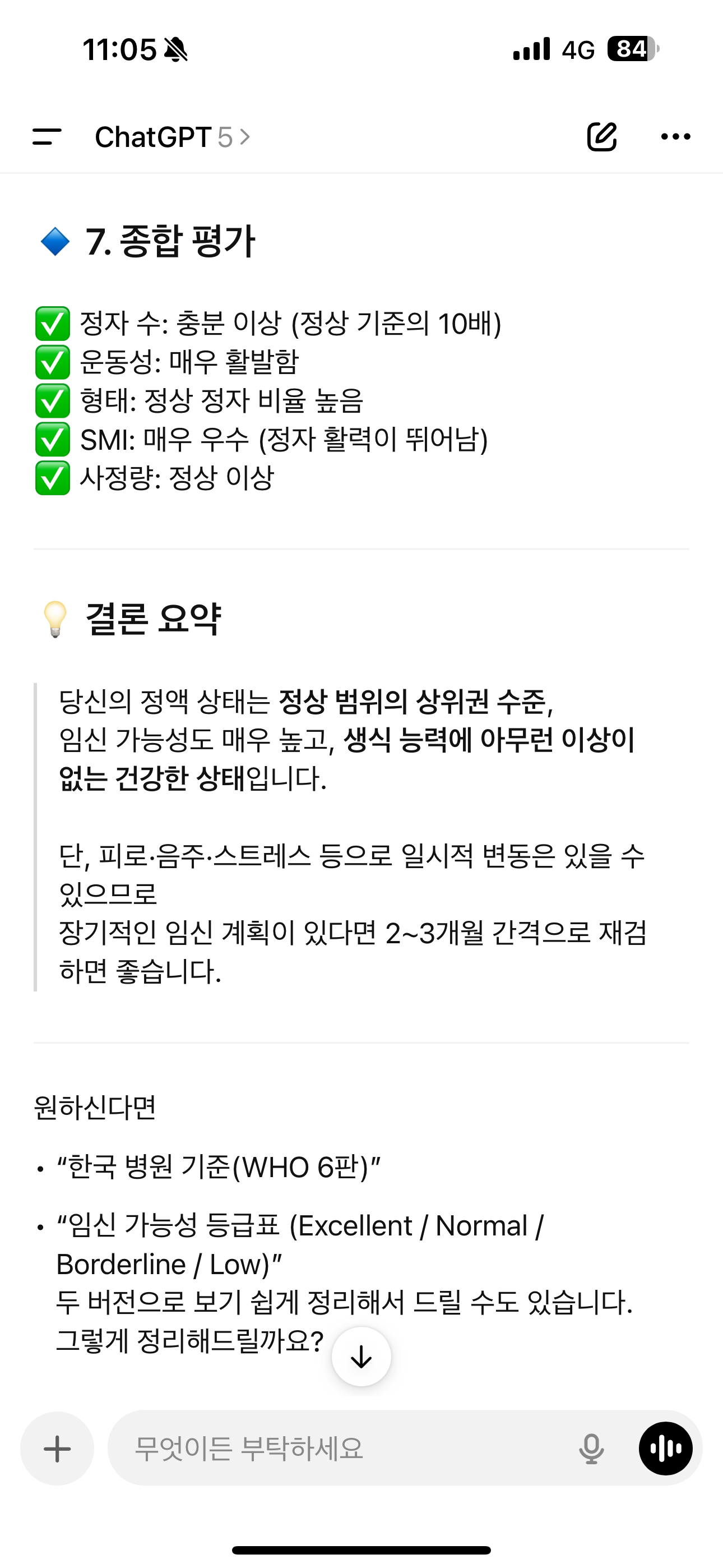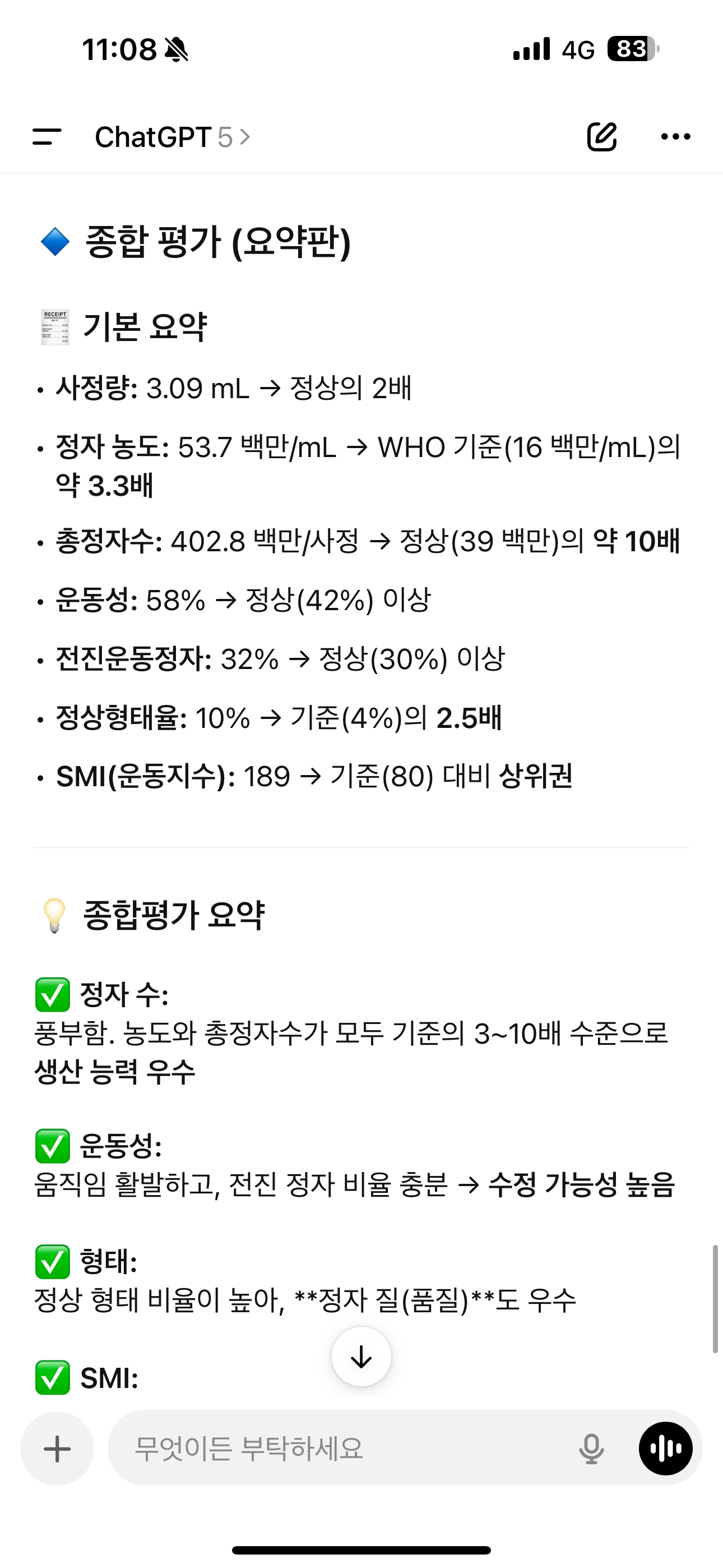 또한 정자수는 기준치보다 10배이상으로 많았으며 , SMI는 기준치보다 2배 이상 높은 결과를 보였다.