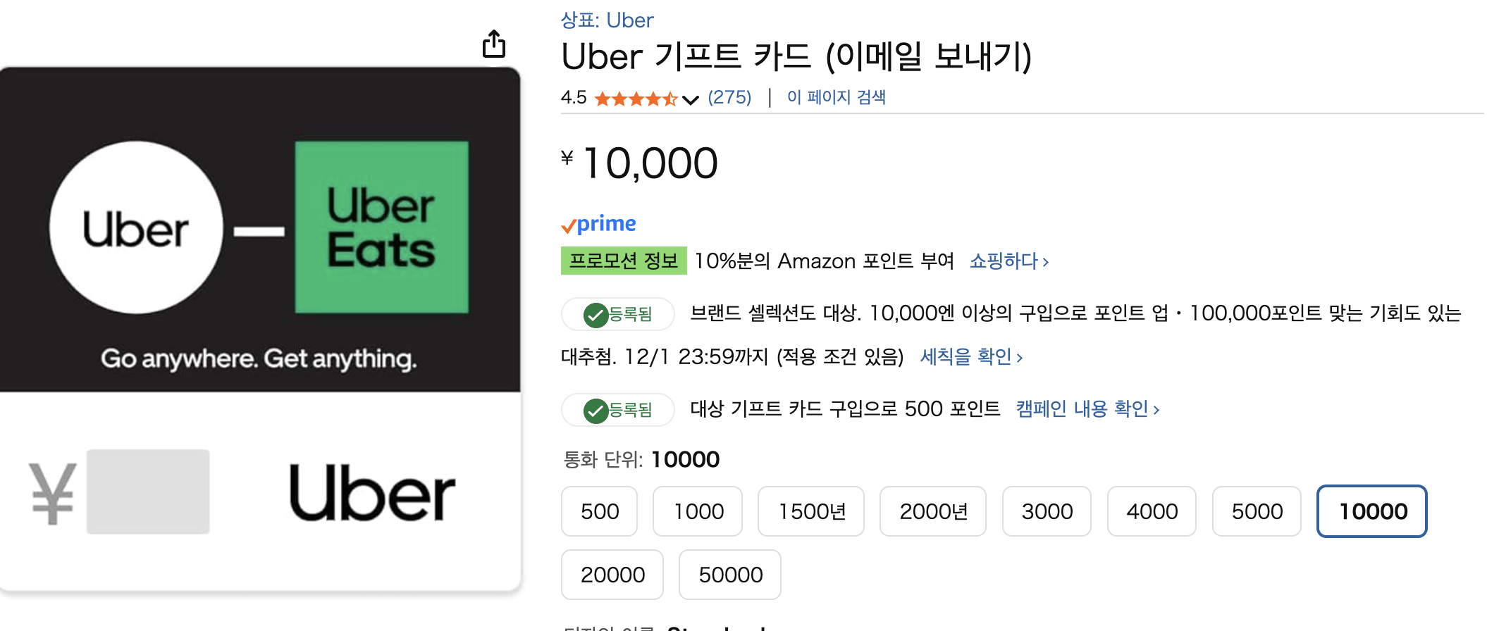 - 우버 기프트카드 10,000엔 → 10% 적립